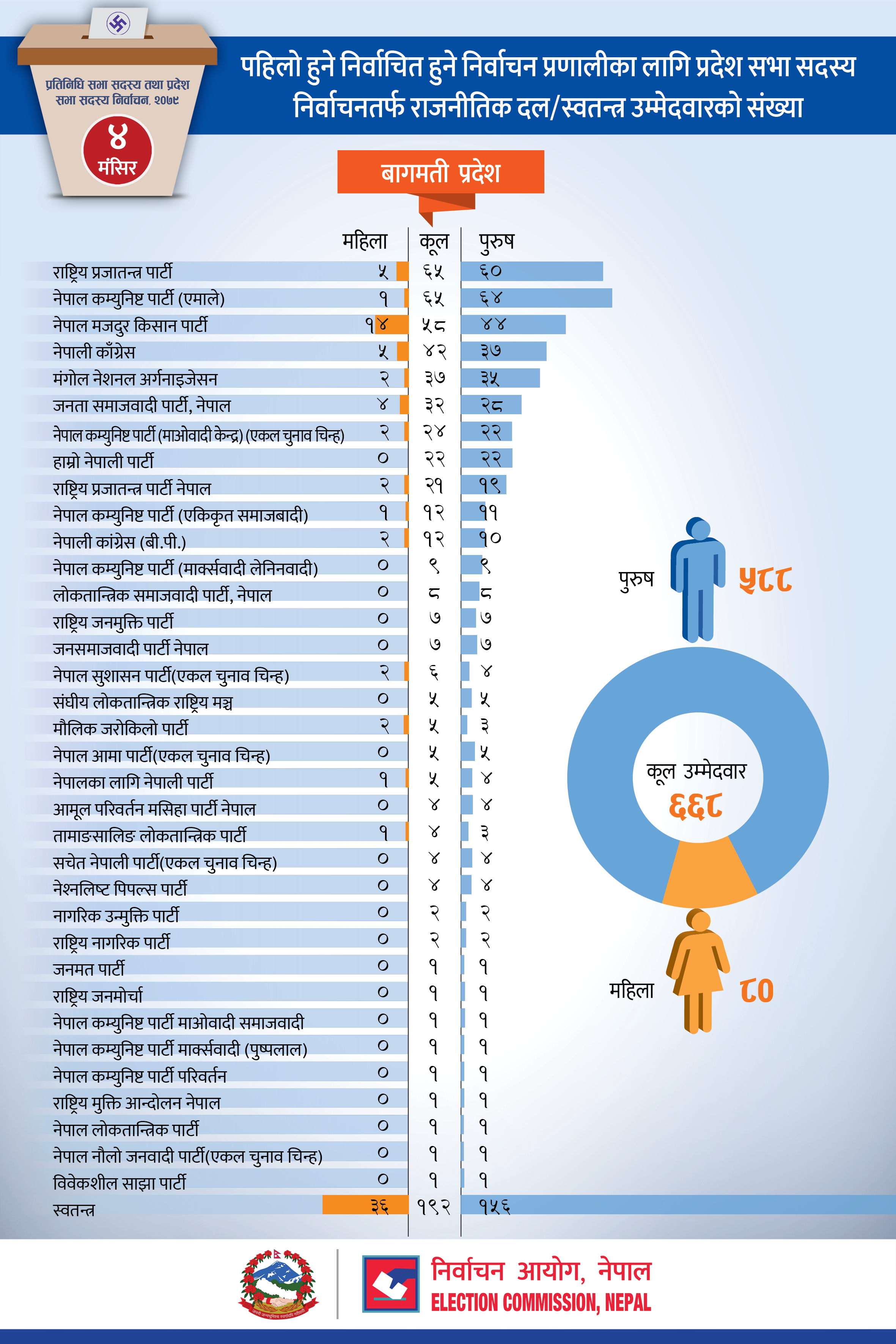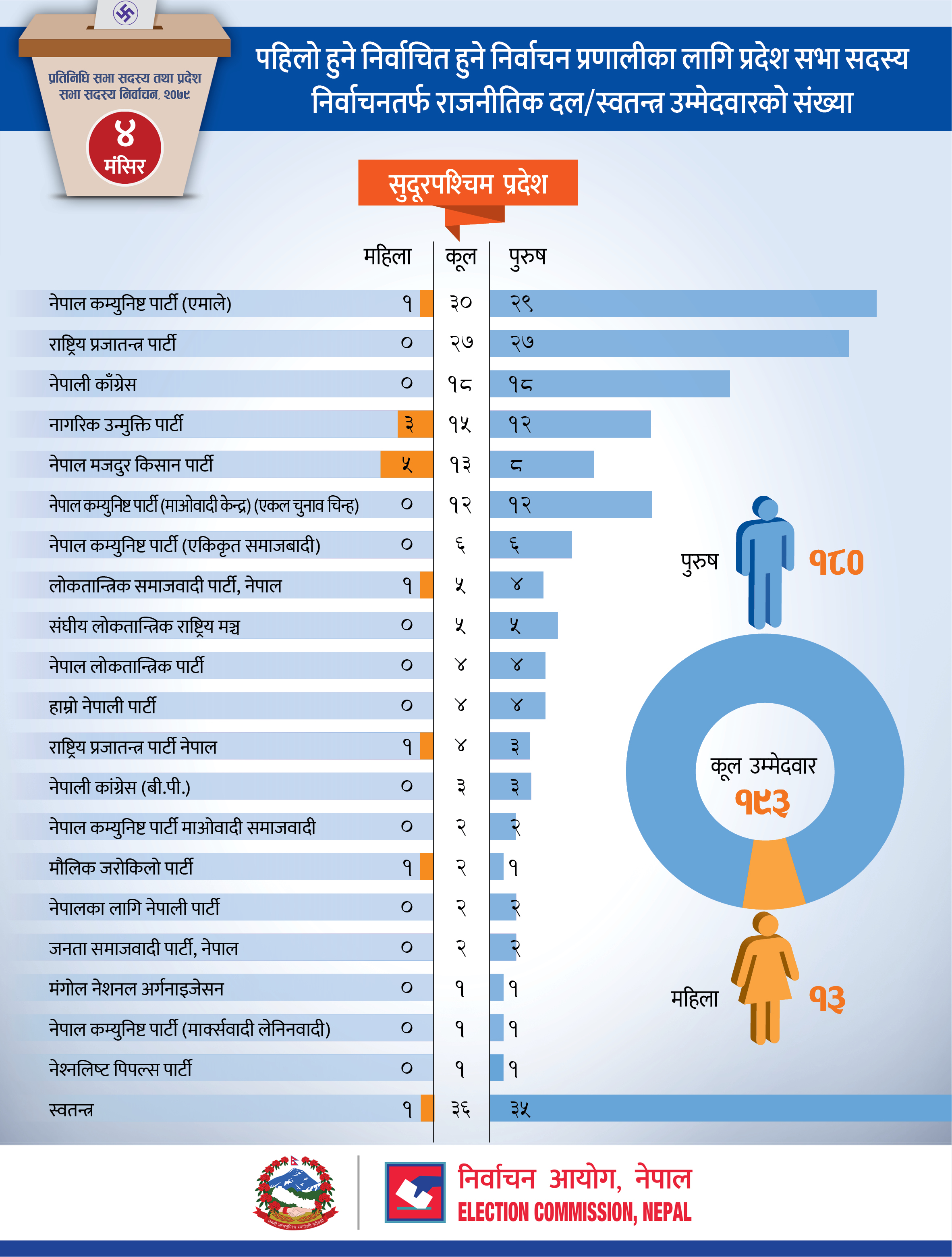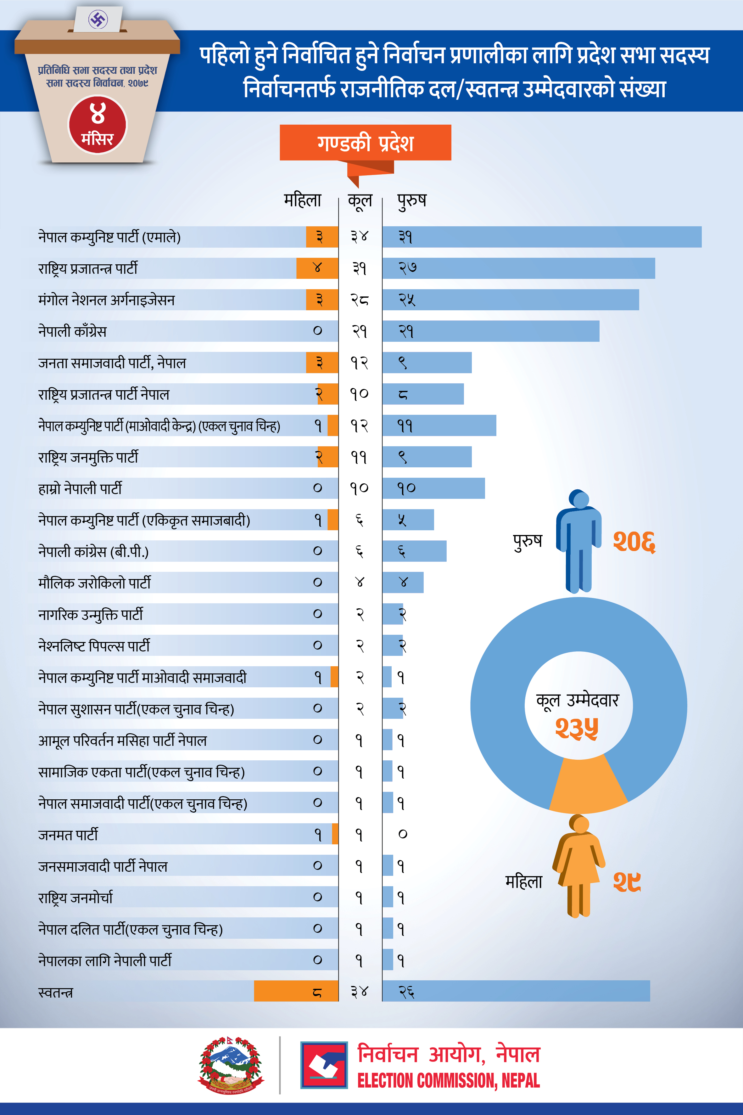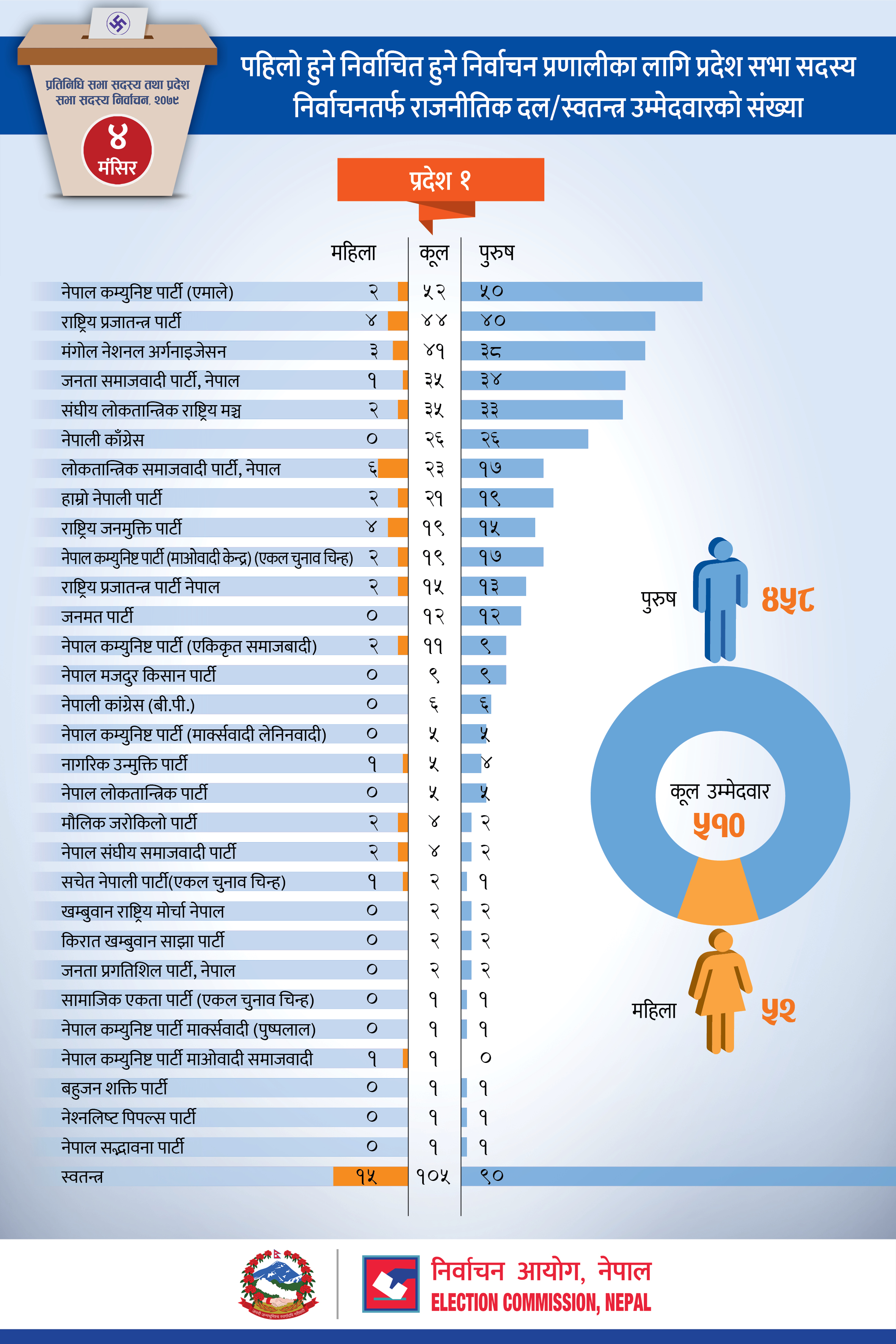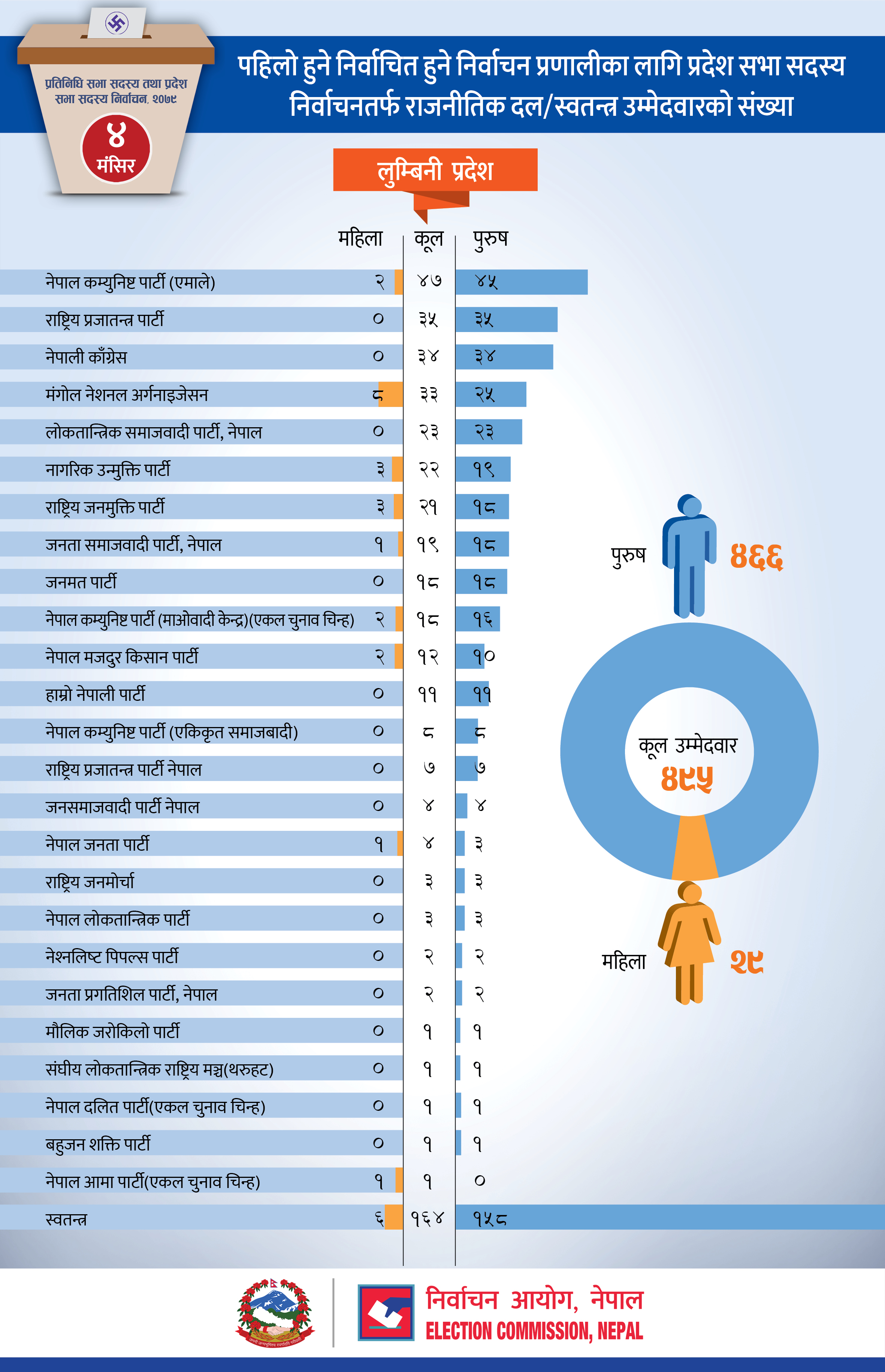 पहिलो हुने निर्वाचित हुने निर्वाचन प्रणालीका लागि प्रदेश सभा सदस्य निर्वाचनतर्फ राजनीतिक दल/ स्वतन्त्र उम्मेदवारको संख्या