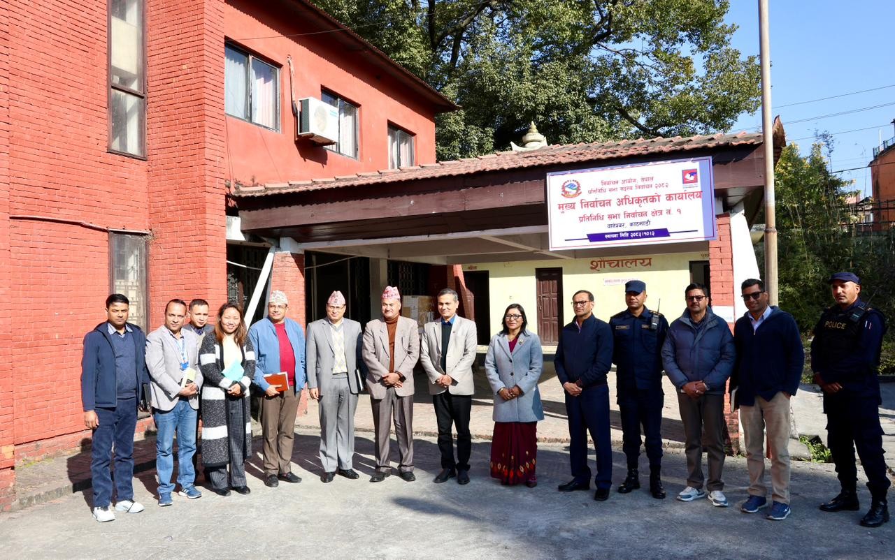 प्रतिनिधि सभा सदस्य निर्वाचन, २०८२ को तयारीको सन्दर्भमा गृहमन्त्री ओमप्रकाश अर्याल, निर्वाचन आयुक्त डा. जानकी कुमारी तुलाधर, गृहसचिव राजकुमार श्रेष्ठलगायतका अधिकारीहरू काठमाडौँ र ललितपुर जिल्लाको मुख्य निर्वाचन अधिकृतको कार्यालय अनुगमन गर्नुहुँदै । तस्बिरः प्रदीपराज वन्त